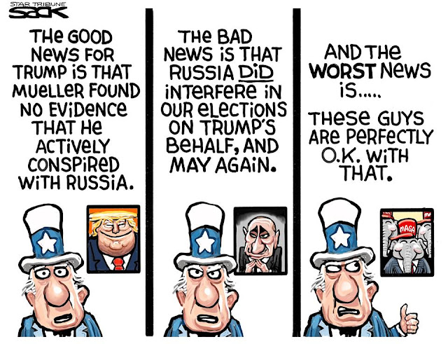 The Mueller report lifted up the rock and left Trump’s minions scurrying for cover. Already, five Trump associates have been convicted of serious crimes, including his former campaign manager, his longtime personal attorney, and his former national security advisor. And we don’t yet know the extent of criminality within the Trump campaign or the Trump White House because he Mueller report includes 12 criminal referrals that have been redacted to protect ongoing cases.